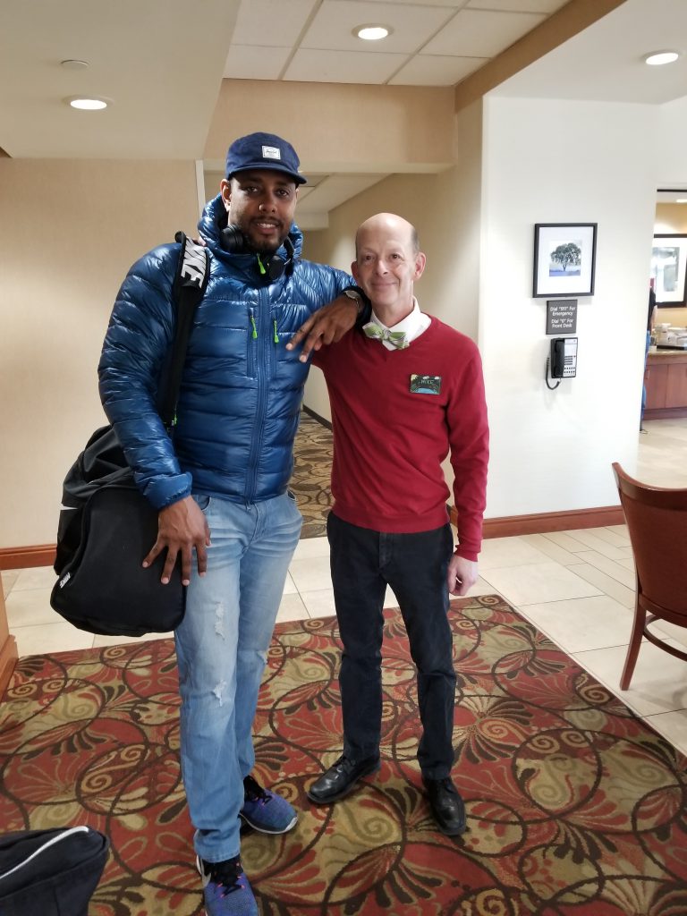Garland Shields visiting Vermont standing next to the hotel concierge